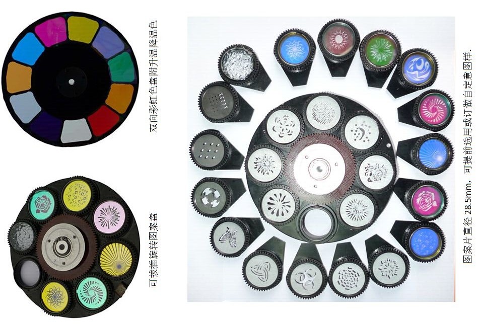 圖案盤:兩個圖案盤,固定圖案盤14個圖案+白光,旋轉圖案盤:9個旋轉圖案+白光。